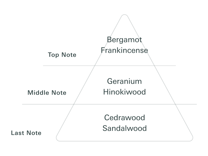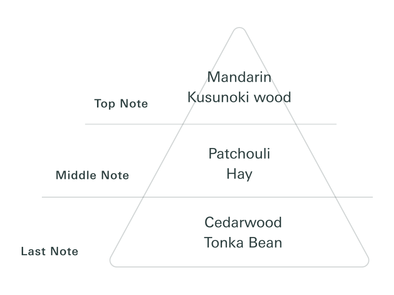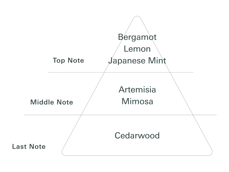 Blend: A woody citrus aroma, formed by citrus and Japanese mint to evoke bright morning light, blended with woody, green, and floral scents reminiscent of a quiet forest blanketed in morning mist.
